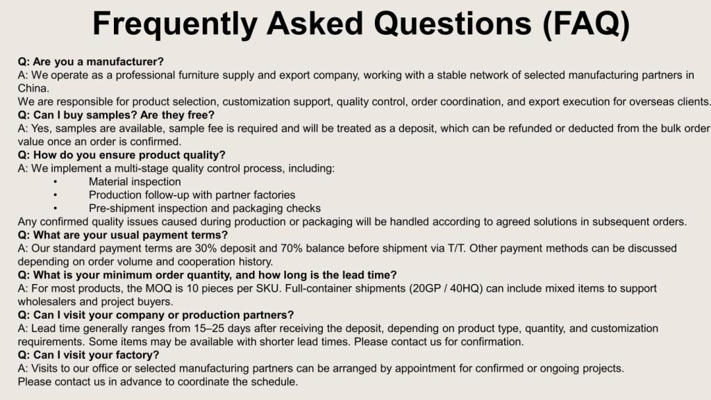 Working with a stable network of selected manufacturing partners across key furniture production regions in China, we support customized designs, flexible configurations and reliable order execution for international markets.